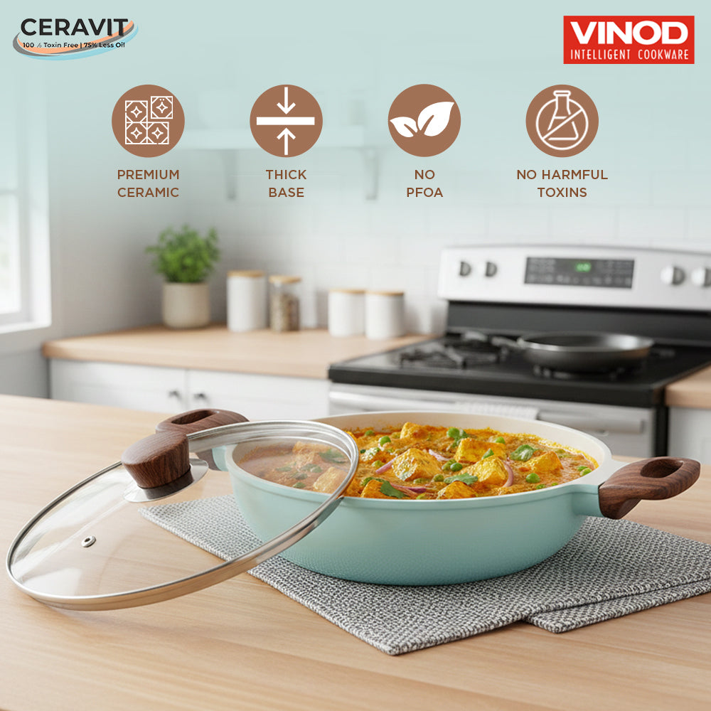 Experience the perfect blend of health and style with the Vinod CERAVIT Kadai, available in three sophisticated shades: Pink, Blue, and Grey. Engineered for the modern kitchen, this kadai features a premium Ceravit toxin-free ceramic coating that allows for healthier, oil-less cooking—using up to 75% less oil for a lifestyle that prioritizes your well-being. The advanced three-layer non-stick surface ensures smooth food release and effortless cleaning, while the wide, thick induction base guarantees even heat distribution across gas, electric, ceramic, and induction cooktops, preventing hotspots and burnt food.