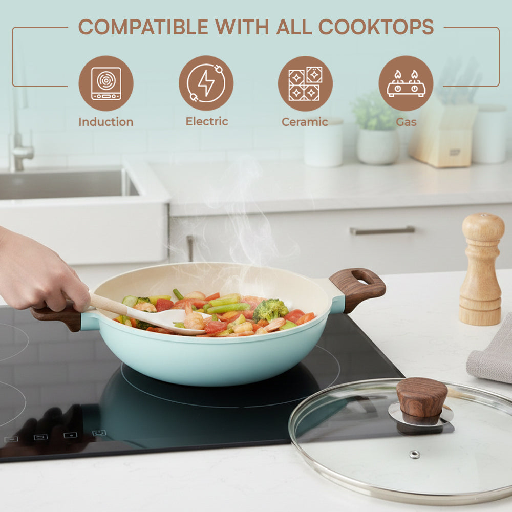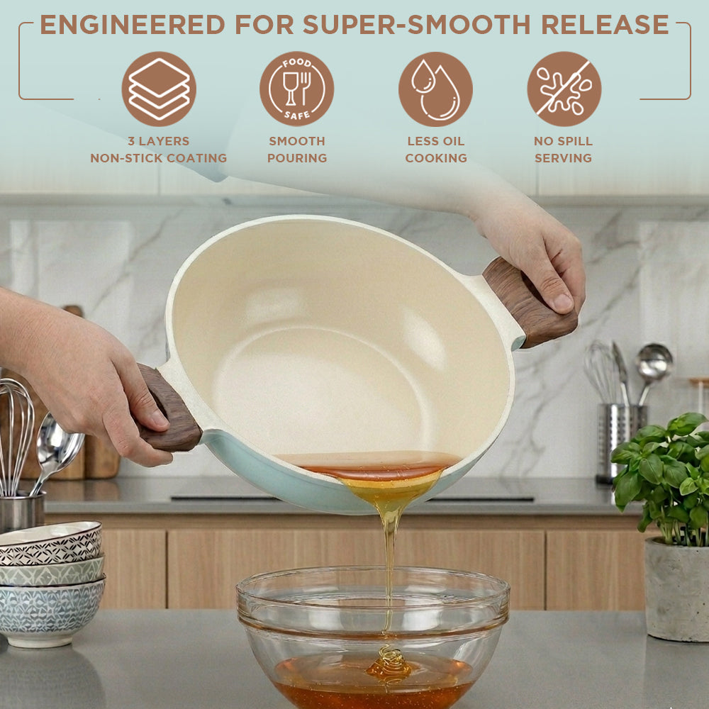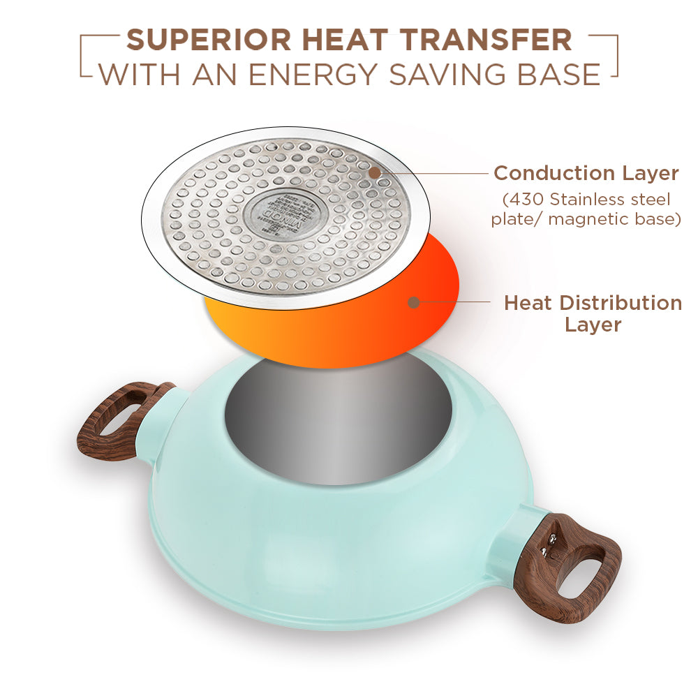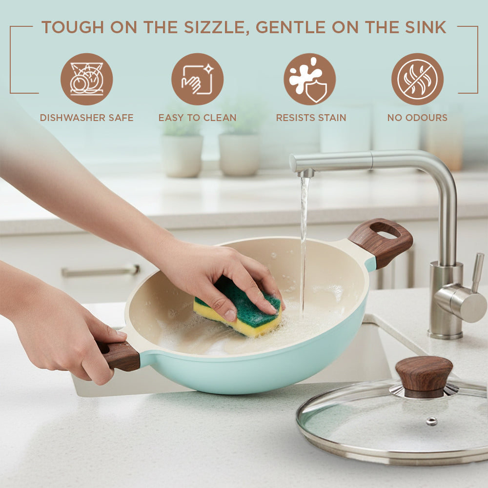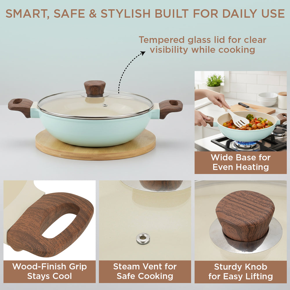 Designed for convenience and durability, the Ceravit Kadai includes a tempered glass lid with a built-in steam vent, allowing you to monitor your meal without losing heat. The sturdy, stay-cool wood-finish handles and matching knob provide a comfortable, heat-resistant grip for safe handling. Whether you are sautéing or deep frying, this stain-resistant and dishwasher-safe cookware is built to last. Upgrade your culinary game with 100% toxin-free technology and a pop of color that matches your kitchen’s personality.