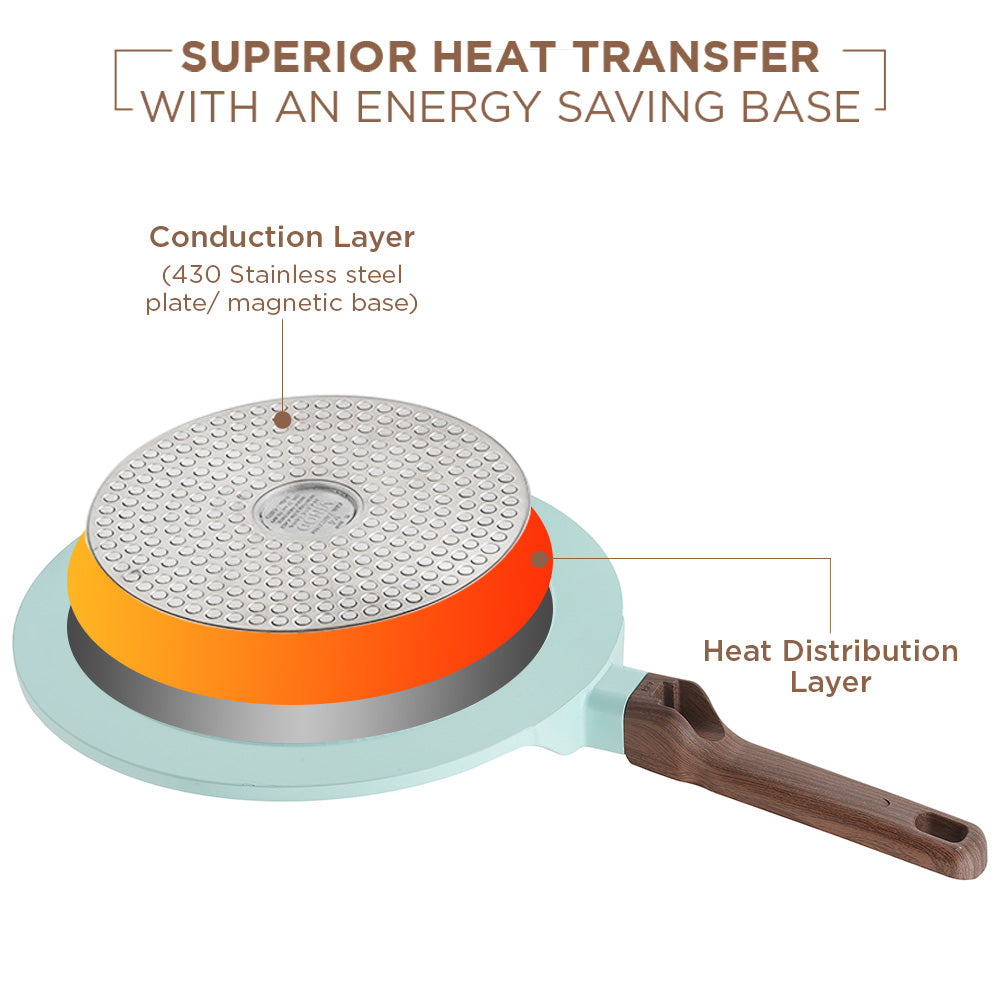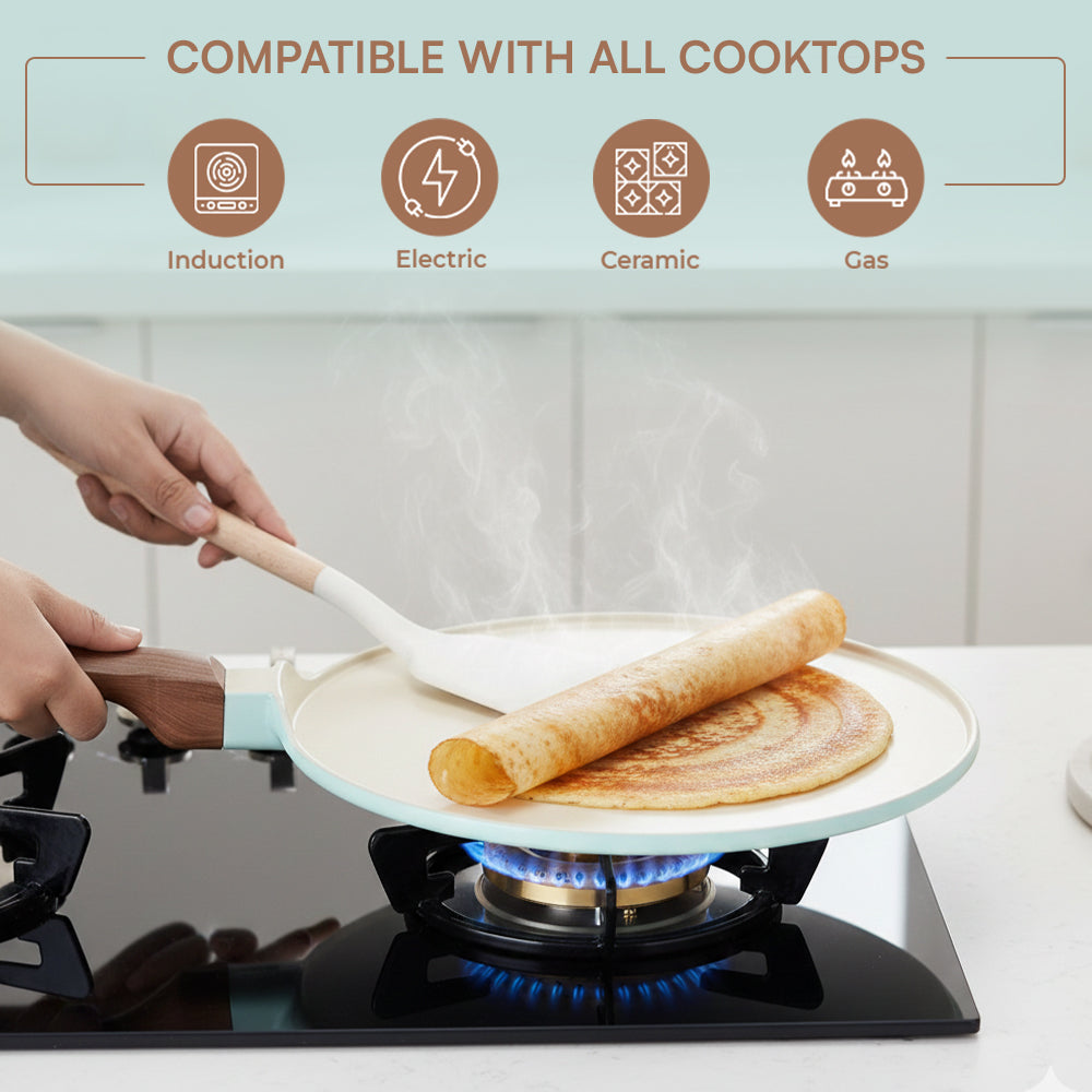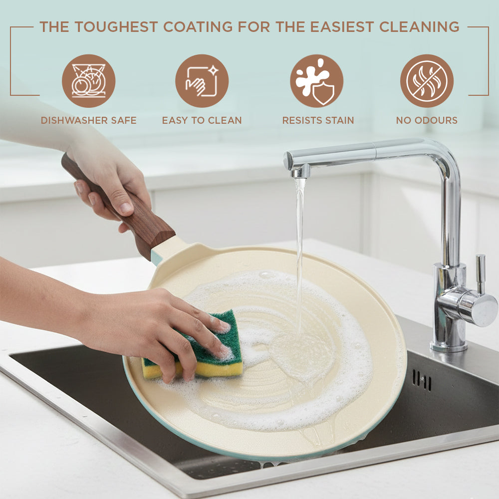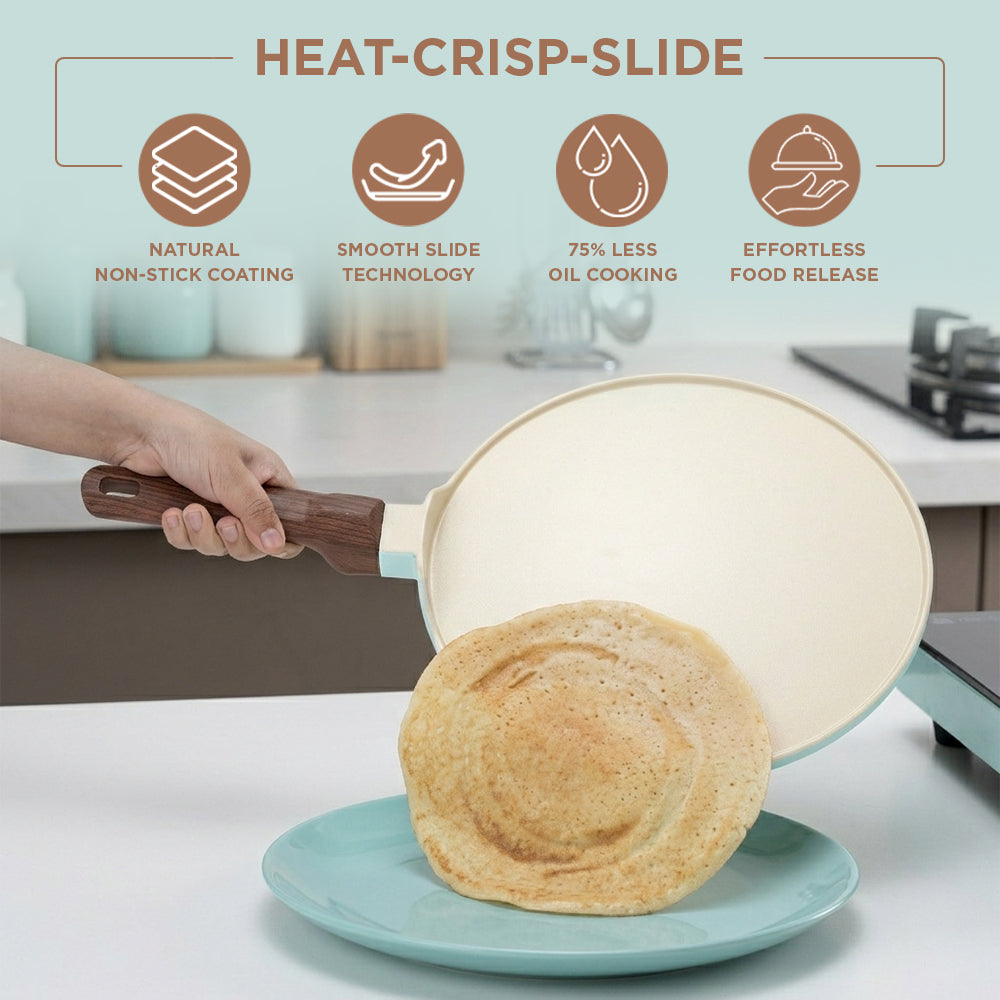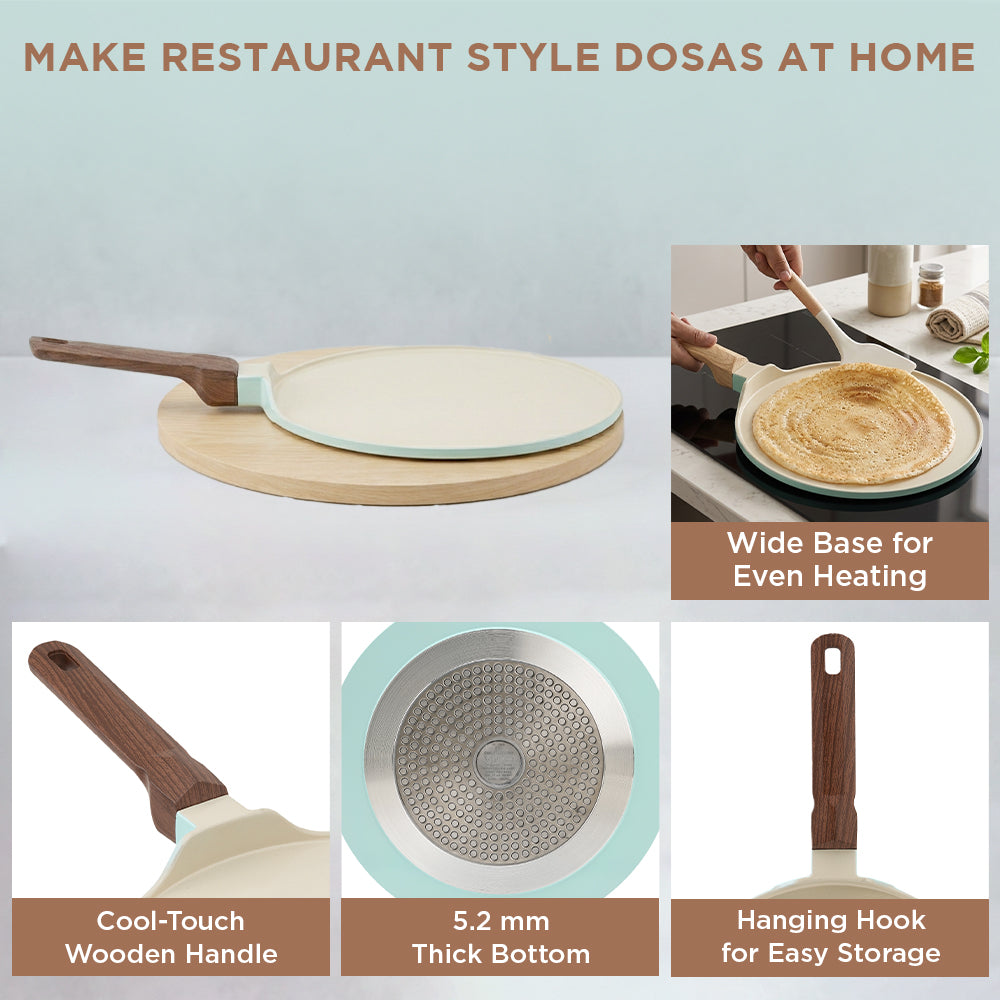 The VINOD CERAVIT Dosa Tawa helps you make restaurant-style dosas at home with perfect crisp results that never stick. Its smooth ceramic non-stick surface allows easy spreading, effortless flipping, and clean release every time. Built with Heat-Crisp-Slide technology and a natural non-stick coating. The wide base and 5.2 mm thick bottom provide even heating, while the cool-touch wooden handle and hanging hook add comfort and convenience. Durable, stylish, and versatile, it is the perfect addition to every kitchen.