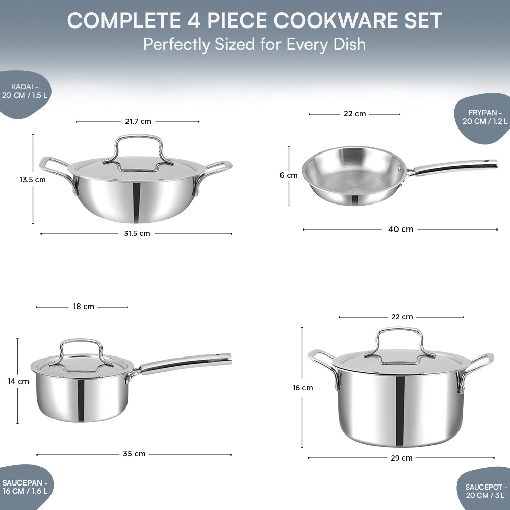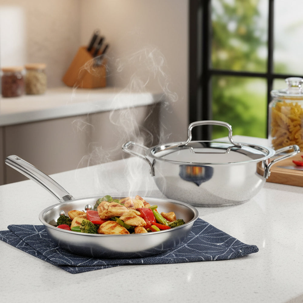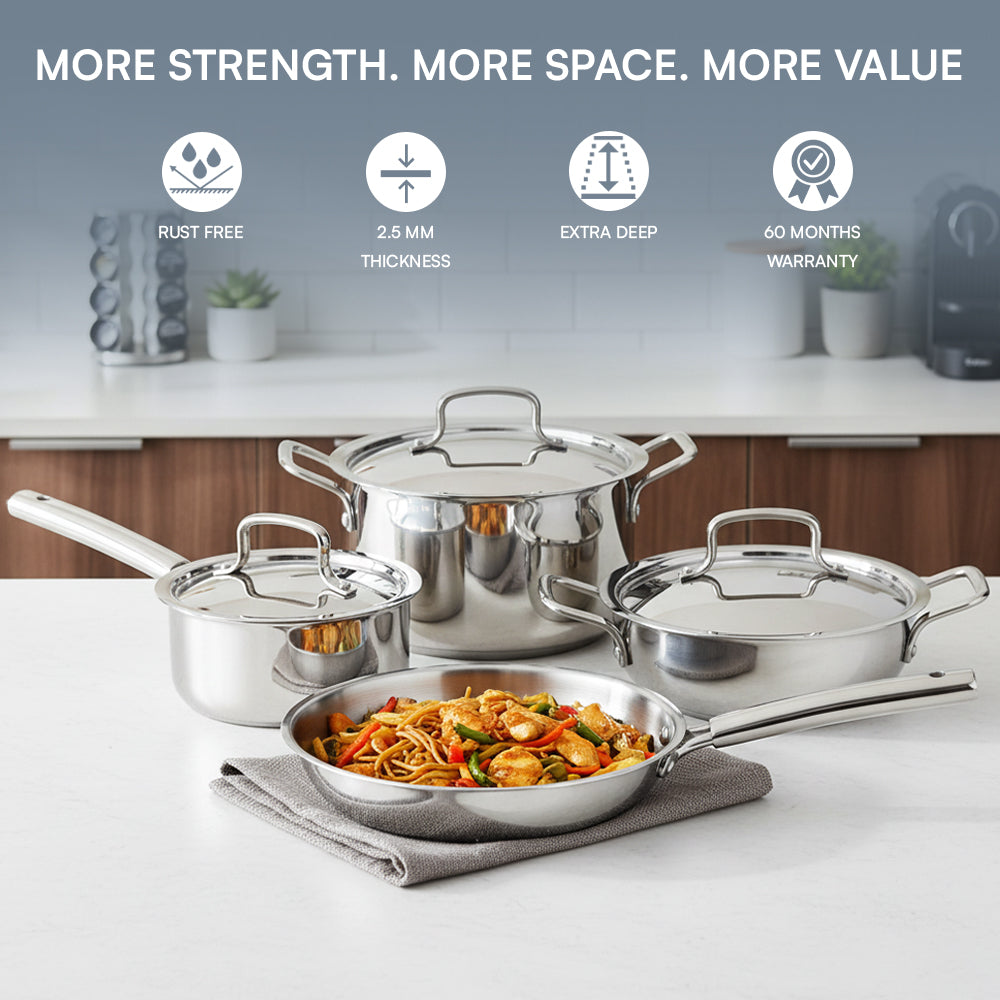 Made from premium triply stainless steel, this cookware set is the epitome of durability and style, offering a perfect blend of form and function. With a 2.5 mm thickness, these pots and pans ensure even heat distribution, reducing hot spots and enhancing your culinary creations.They're also dishwasher safe, saving you time and effort.