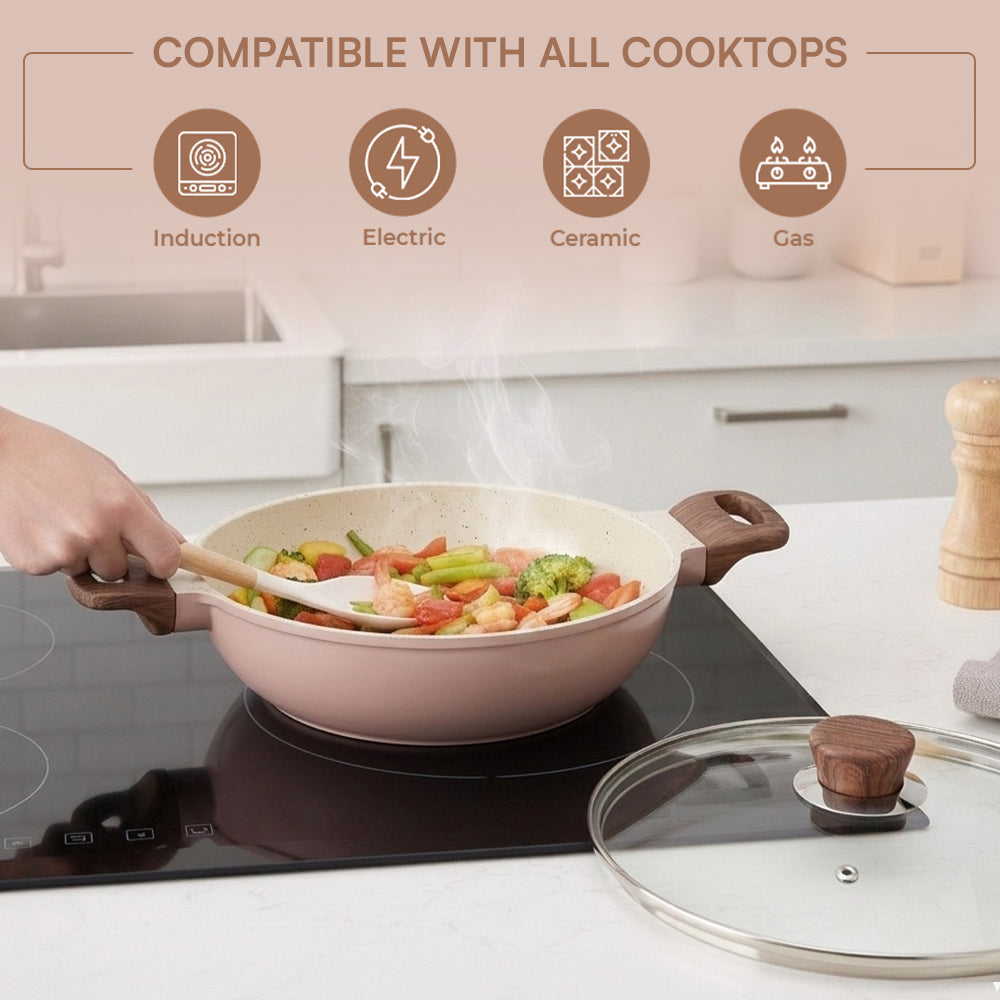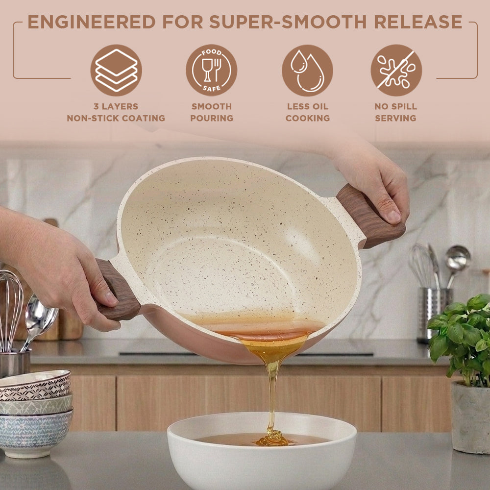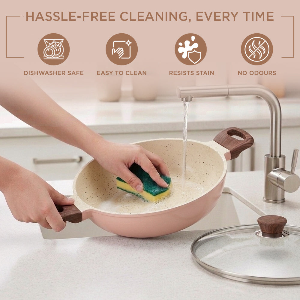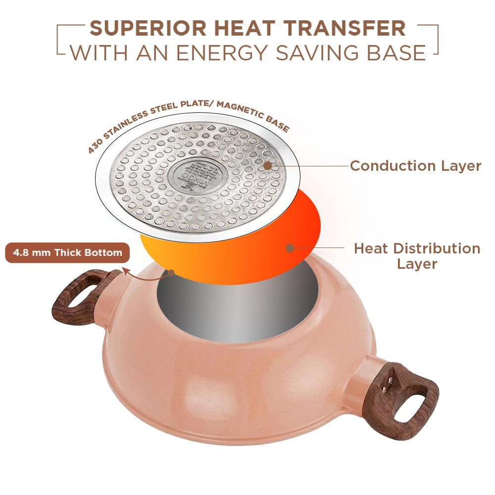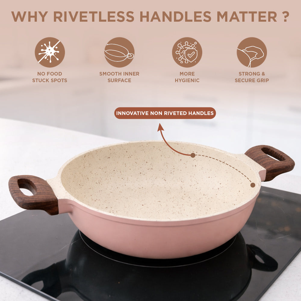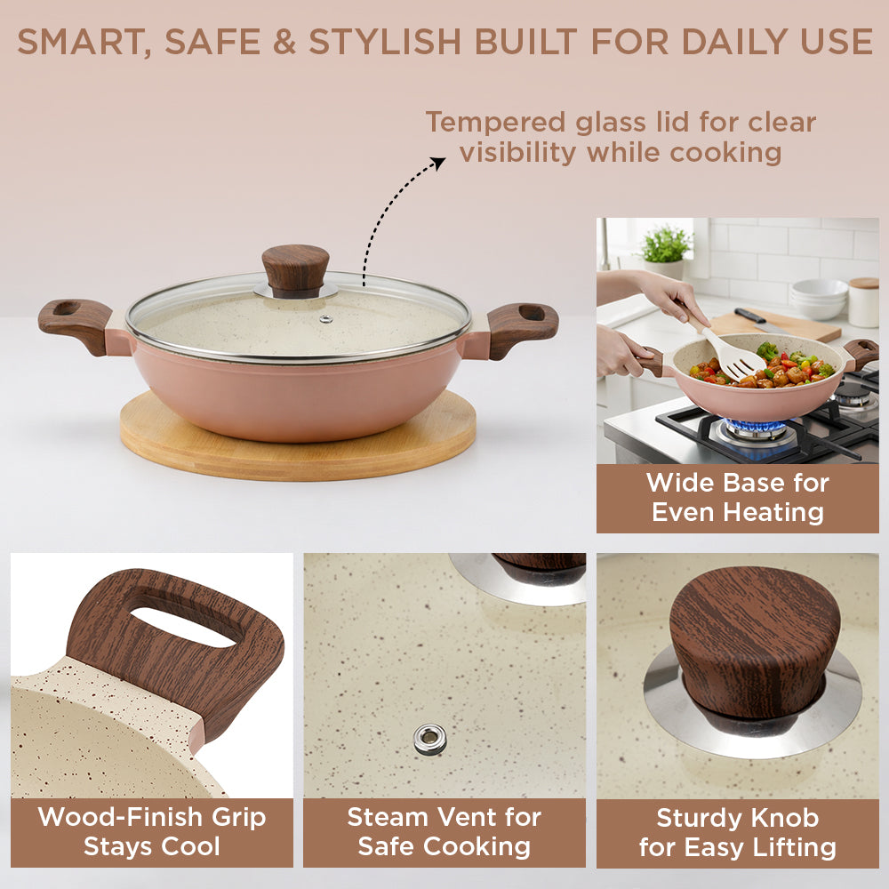 Experience the perfect blend of health and style with the Vinod CERAVIT Kadai, available in three sophisticated shades: Desert Rose. Engineered for the modern kitchen, this kadai features a premium Ceravit toxin-free ceramic coating that allows for healthier, oil-less cooking—using up to 75% less oil for a lifestyle that prioritizes your well-being. The advanced three-layer non-stick surface ensures smooth food release and effortless cleaning, while the wide, thick induction base guarantees even heat distribution across gas, electric, ceramic, and induction cooktops, preventing hotspots and burnt food.