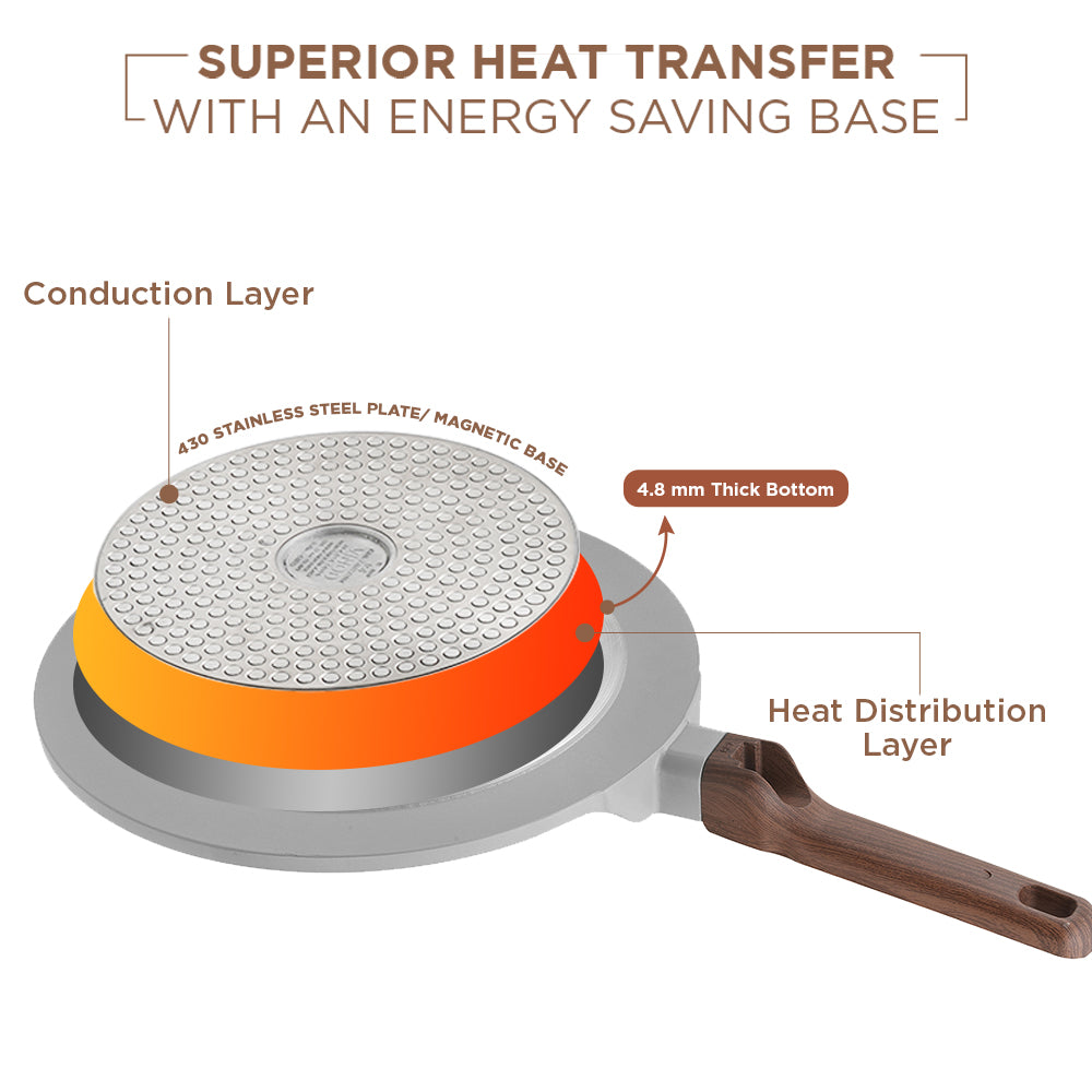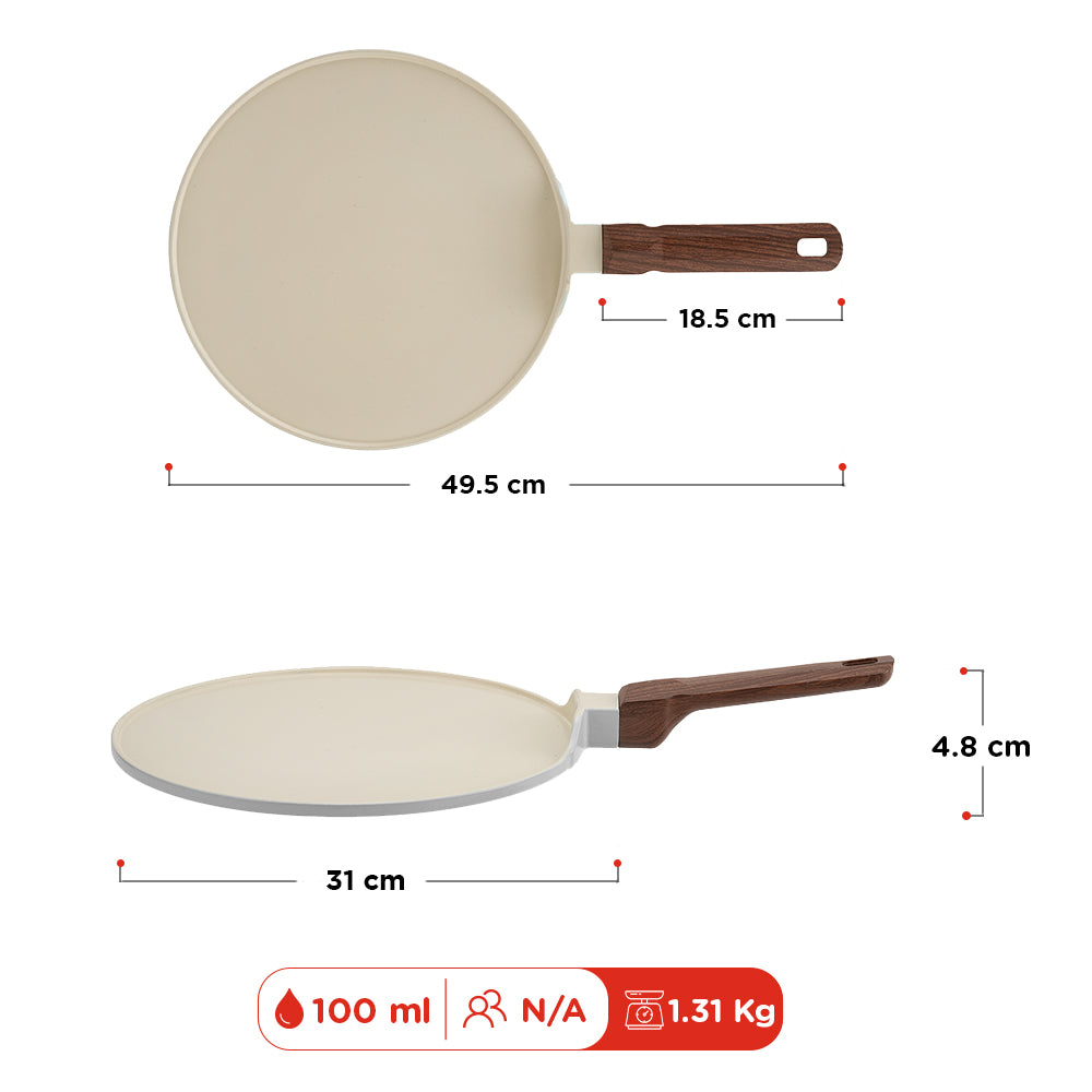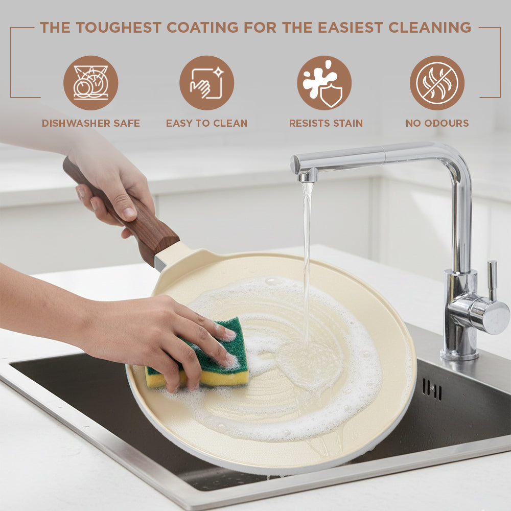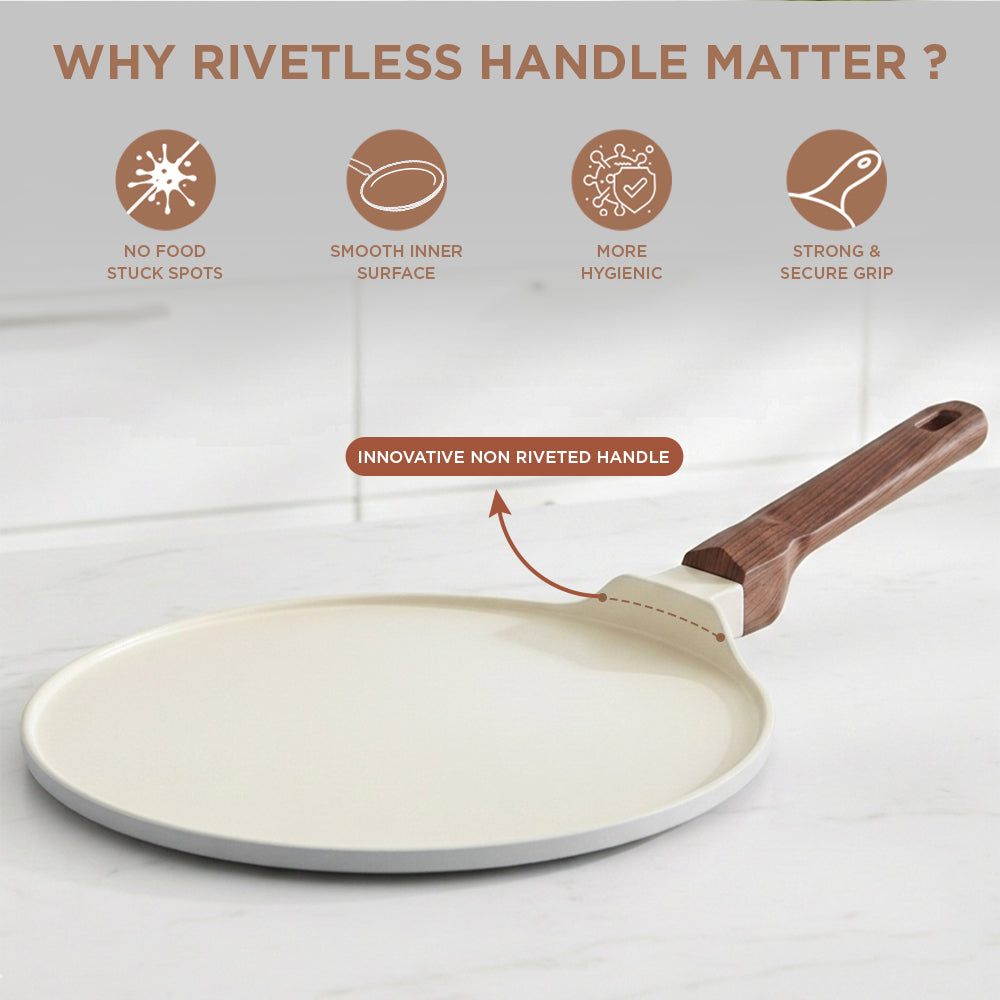 The VINOD CERAVIT Dosa Tawa helps you make restaurant-style dosas at home with perfect crisp results that never stick. Its smooth ceramic non-stick surface allows easy spreading, effortless flipping, and clean release every time. Built with Heat-Crisp-Slide technology and a natural non-stick coating. The wide base and 5.2 mm thick bottom provide even heating, while the cool-touch wooden handle and hanging hook add comfort and convenience. Durable, stylish, and versatile, it is the perfect addition to every kitchen.